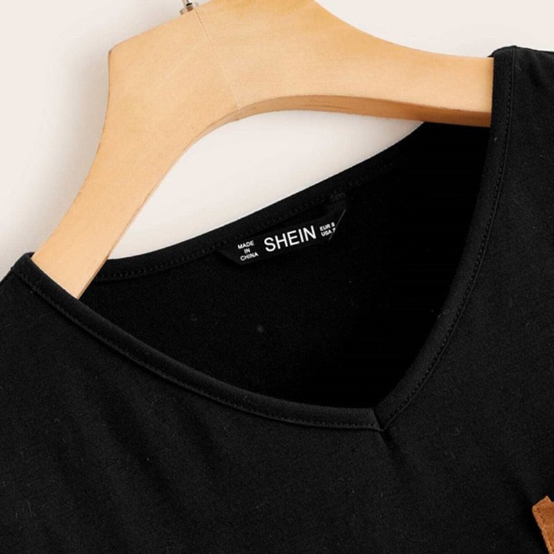 Black And White Pocket Patched Striped Tee Dress Women Spring Long Sleeve Ladies Basic Straight Short Casual Dresses