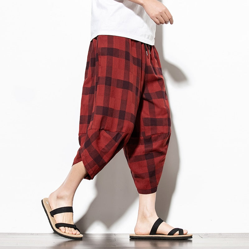 Streetwear Mens Cotton Beach Pants Male Summer Casual Calf-Length Pants Man Plaid Hip Hop Baggy Loose Trousers