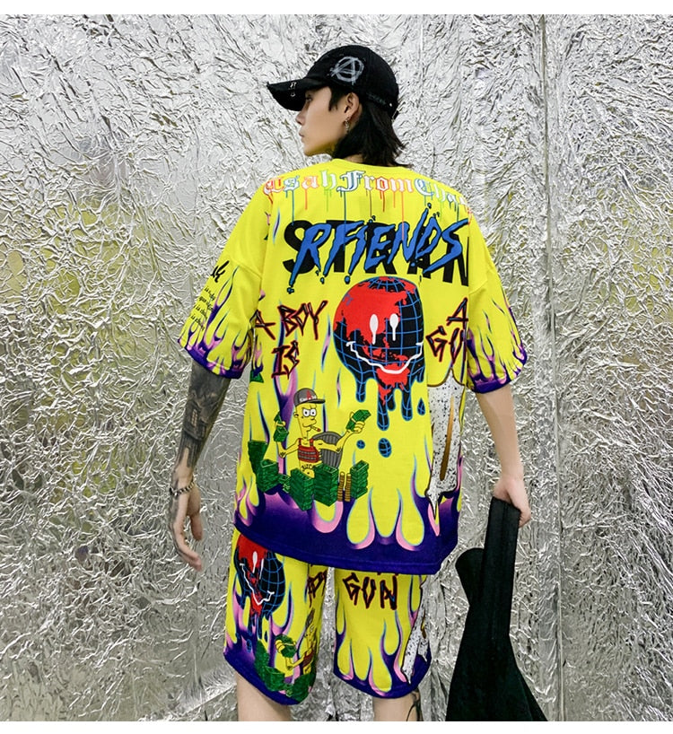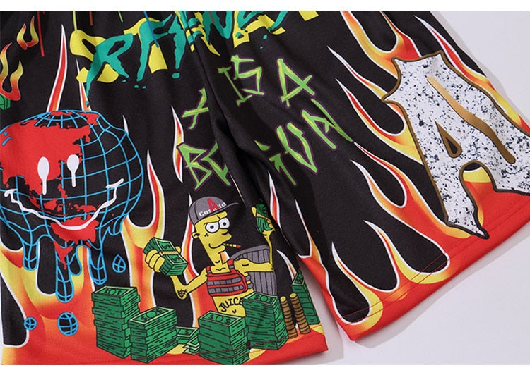 Men Cartoon Flame Graffiti Print Beach Knee-length Shorts Hip Hop Bermuda Style Elastic Waist High Street Summer