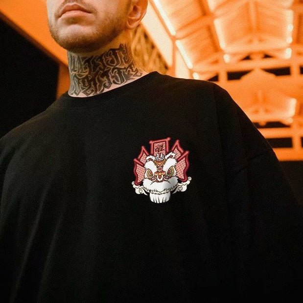 Cotton T-shirt Lion Dance Print Tide brand Hip Hop short sleeve Tee Chinese style man Summer street Fashion Casual top