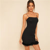 Black Faux Fur Hem Bodycon Slip Mini Dress Women Autumn Solid Slim Fit Spaghetti Strap Party Night Out Pencil Dresses