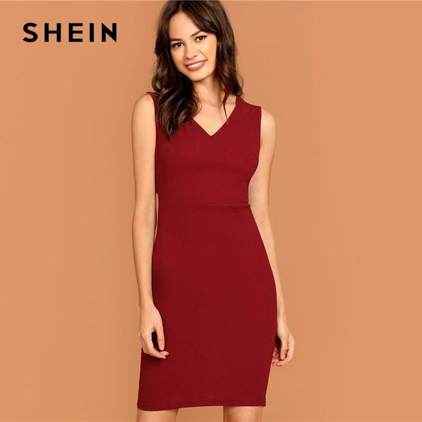 Burgundy Plunging Neck Pencil Dress Solid Sleeveless V Neck Bodycon Dress Elegant Party Autumn Modern Lady Women Dresses