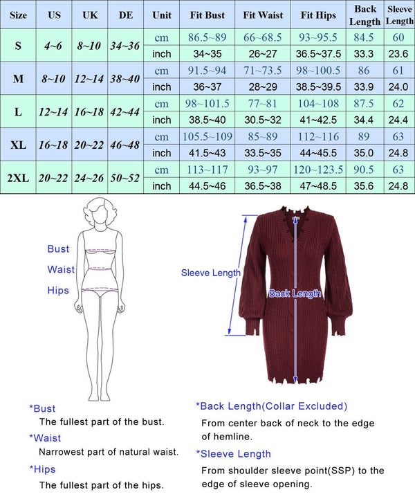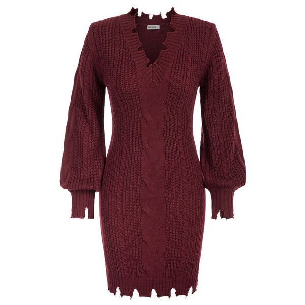 GK Women Cable Knitted Sweater Dress Long Lantern Sleeve V-Neck Distressed S Version Style Knitted Dress Clothing