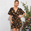 Multicolor Bell Sleeve Belted Floral Print Dress Women Summer High Waist V Neck A Line Flared Boho Mini Dresses
