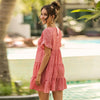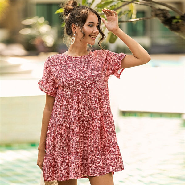 Red Ditsy Floral Print Ruffle Hem Smock Dress Women Summer O-neck Ruffle Hem Loose Boho Cute Mini Chiffon Dresses