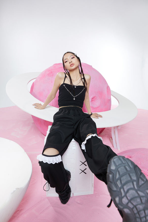 Solid Pure Contrast Lace Straight Casual Women Pants,Spring Vintage High Waist Ripped Hole, Ladies Daily Trouser
