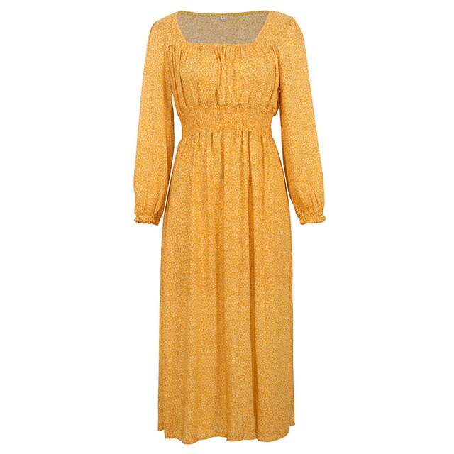 Women Side Split Dress Square Neck Long Sleeve Smock Waist Casual Party Vacation Holiday Boho Swing Print Floral Dresses Fall