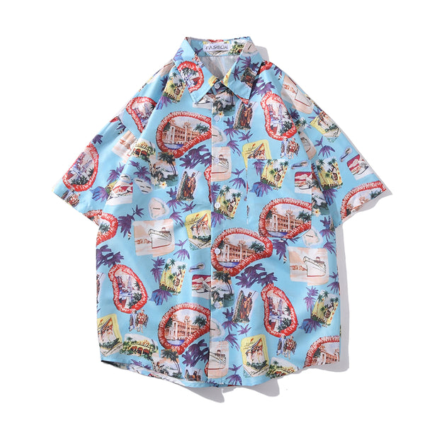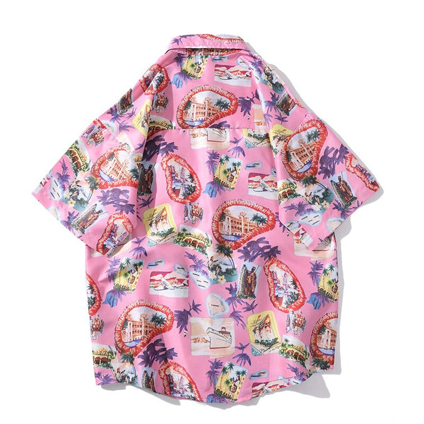 Summer Korean Flower Shirt Fashion Beach Holiday Pink Shirt Casual Mens Short Sleeve Hawaiian Shirts