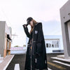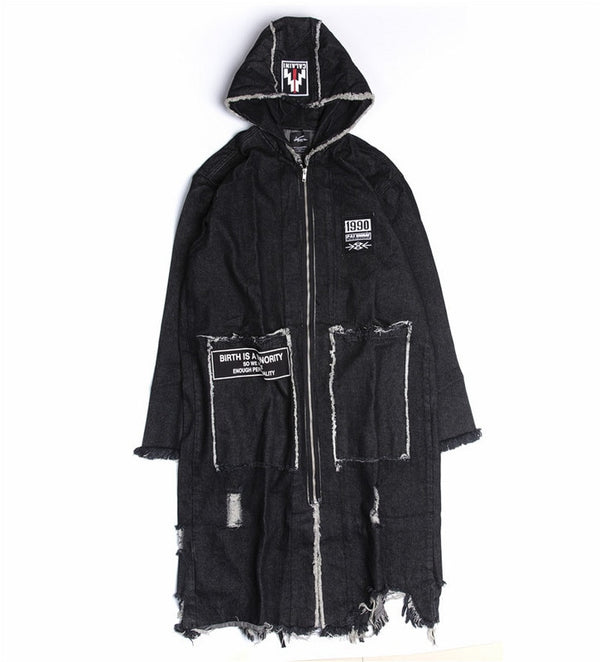 Hip Hop Hole Hooded Long Trench Jackets Coats Men Raw Edge Cloak Male Capes Gothic Punk Steampunk Overcoat Print Denim Full